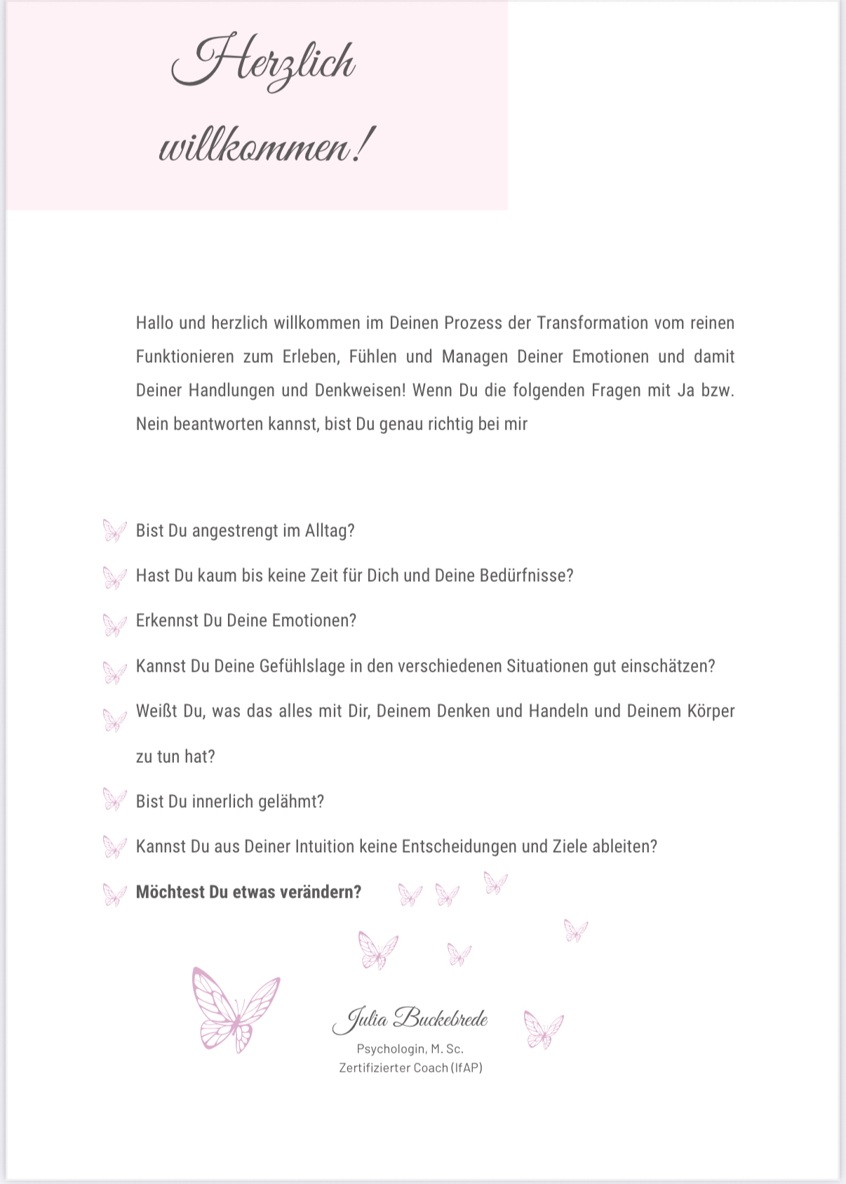 Hallo und herzlich willkommen im deinen Prozess der Transformation vom reinen Funktionieren zum Erleben, Fühlen und Managen Deiner Emotionen und damit deiner Handlungen und Denkweisen! Wenn du die folgenden Fragen mit „Ja“ bzw. „Nein“ beantworten kannst, bist du genau richtig bei mir!